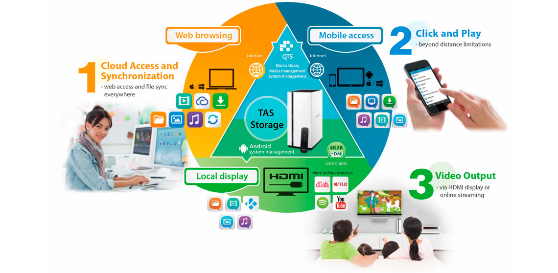 Com interface de usuário web, o sistema operacional QTS, oferecido pelo NAS doméstico, é uma ferramenta para ajudar no gerenciamento dos arquivos armazenados, sendo possível instalar e gerenciar aplicativos como cloud services, armazenamento de dados, backup, gerenciamento e aplicativos multimídia.