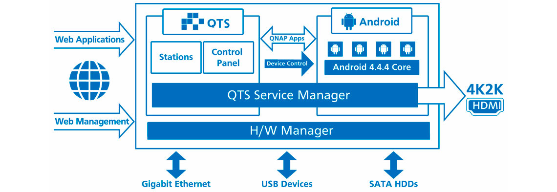 O novo sistema possui foco em Android que permite a reprodução de vídeo 4K em H.264 e H.265 via conexão HDMI, permite executar apps Android e instalar novos softwares via Google Play. Os 2 sistemas compartilham o mesmo banco de dados, por isso todo conteúdo multimídia e documentos que podem ser acessados pelo QTS e Android simultaneamente.