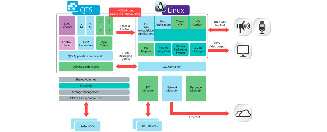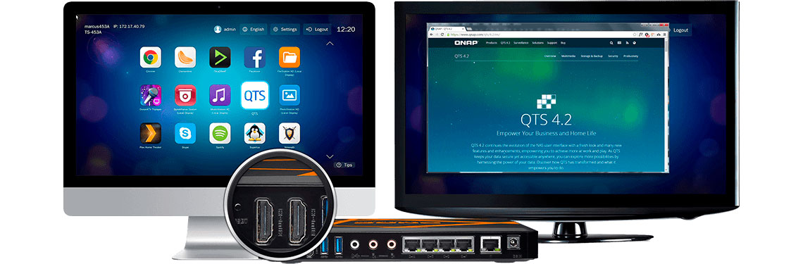 O sistema duplo QTS-Linux do TBS-453A integram tecnologias avançadas de virtualização. A arquitetura do NASbook permite que os usuários aproveitem as variáveis opções no QTS 4.2, realizando downloads de aplicativos do QTS App Center, que utilizem pacotes IoT para Linux, e exibi-los com saída HDMI.