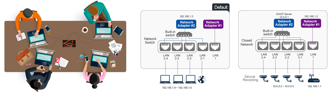 No modo switch padrão, os usuários podem usar a funcionalidade do switch no TBS-453A, para compartilhar dados e recursos de internet e do NAS, de forma simultânea. Na rede privada, é viável a criação de uma rede fechada, podendo criar ambientes seguros, seja um sistema seguro de vigilância e gravação com câmeras de IP.