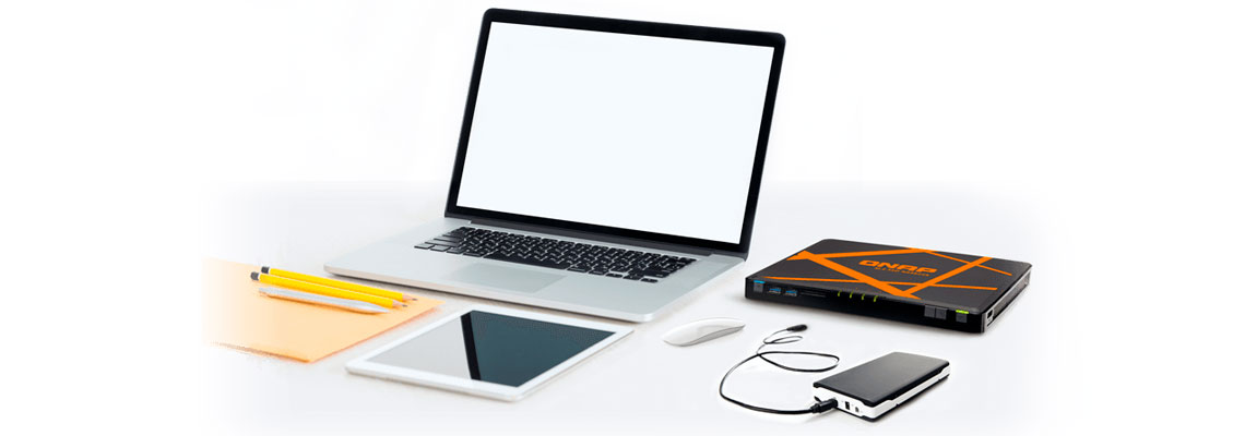 O NASbook com sistema operacional QTS é ideal para reuniões em ambiente corporativo e aplicativos de multimídia, proteção RAID, compartilhamento de acesso à rede, com usuários online ou offline.