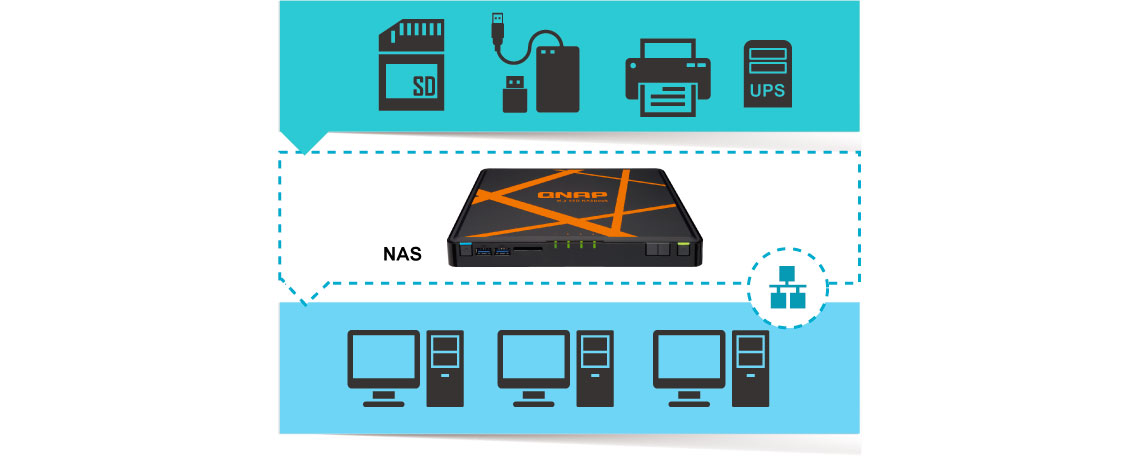 Quando o NASbook é conectado a um DAS, é fácil compartilhar o conteúdo com outros usuários sem ter de desconectar e se mover. As portas USB no NASbook também suportam dispositivos como UPS e impressoras para maior funcionalidade.
