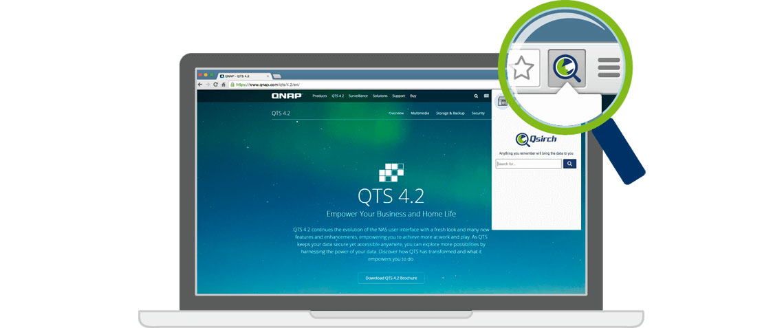 O Qsirch é uma ferramenta de busca quase em tempo real para uma rápida procura de arquivos. Além de pré-visualização de miniaturas, o Qsirch encontra e visualiza e-mails do Gmail que estão armazenados no TBS-453A.