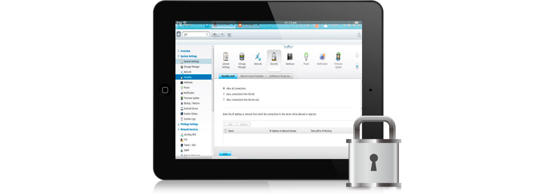 Em um ambiente de rede aberta, os dados das empresas podem estar expostos a ataques cibernéticos. O NASbook Qnap disponibiliza diversas opções de segurança, tais como acessos criptografados, bloqueio de IPs e outras características de segurança.