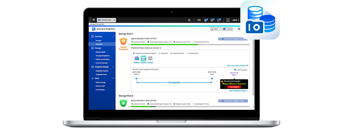 A ferramenta de snapshot baseada na web faz a função de recuperação de dados no TBS-453A a qualquer momento. Até 1024 snapshots dos volumes e de LUN podem ser tirados e replicados com desempenho via snapshots de LUN/volume para servidores remotos, copiando apenas as alterações feitas, e clonar um snapshot volume/LUN como um volume local sem interromper a operação do sistema.