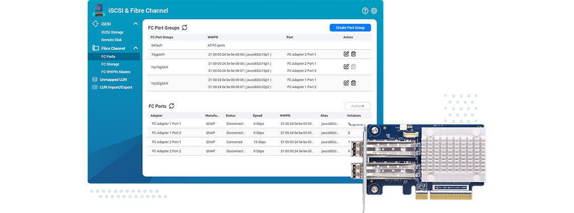 O usuário pode contar com opções mais econômicas para integrar o NAS a um ambiente de SAN com facilidade. Após a instalação de uma placa Fibre Channel Marvell, ATTO ou Qnap no TDS-16489U R2, é possível configurar um alvo Fibre Channel usando o aplicativo iSCSI & Fibre Channel e aproveitar os vários benefícios do Qnap NAS, incluindo a proteção de snapshots, o armazenamento em camadas do Qtier, aceleração de cache SSD e muito mais.