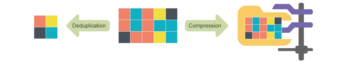 O QES suporta eliminação de duplicação de dados baseada em bloco para recuperar o armazenamento, utilizado por dados redundantes/repetidos e compactação de dados em linha para diminuir o tamanho dos arquivos.