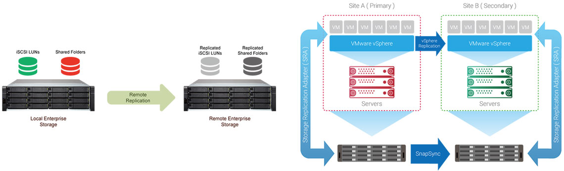 O QES suporta até 65.535 snapshots para iSCSI LUN e pastas compartilhadas. Replicar snapshots para servidores remotos usando o SnapSync em nível de bloco. Em caso de falha ou corrupção de dados no site principal, o SnapSync ajuda as empresas a retomarem os serviços essenciais no menor tempo possível.