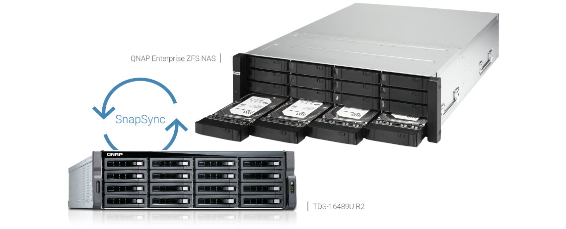 Ao utilizar o sistema operacional do QES, o TDS-16489U R2 é o armazenamento de backup ideal para o Enterprise ZFS NAS com controladora dupla usando o SnapSync.