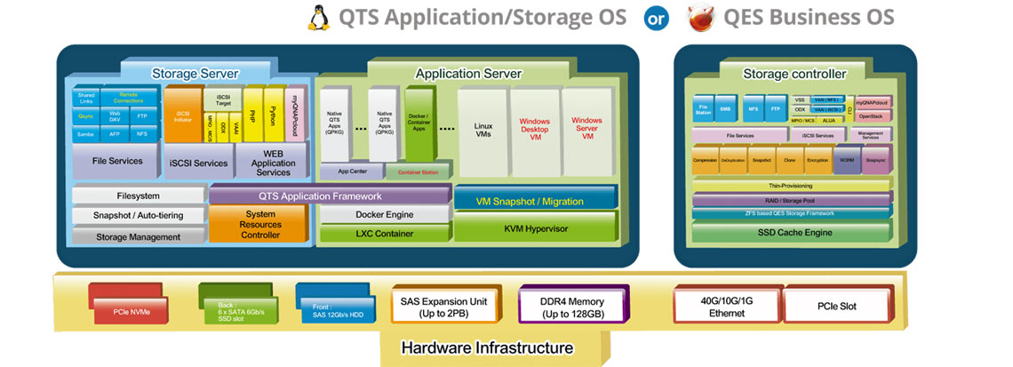 Além de integrar um servidor de aplicativo e um servidor de armazenamento em um sistema, o NAS oferece também a opção de usar o QES (um SO de nível empresarial que oferece armazenamento eficiente e seguro para tarefas de missão crítica) ou QTS (um SO rico em recursos para servidores de aplicativos de armazenamento e diversos).