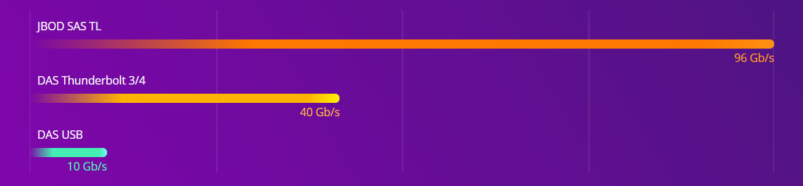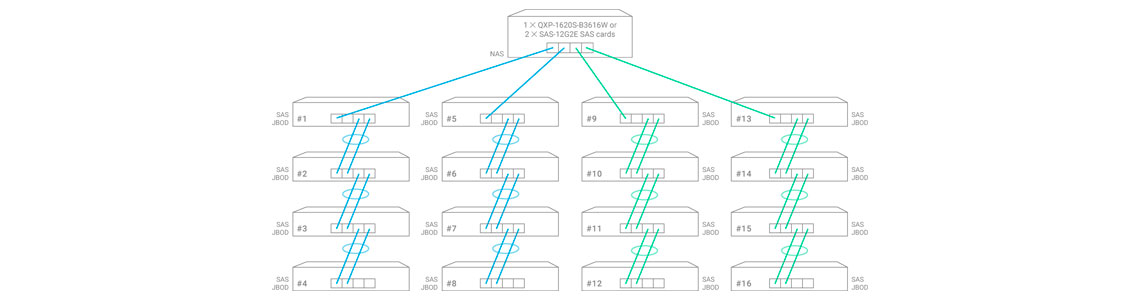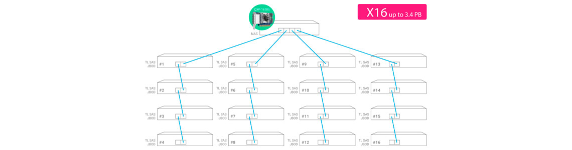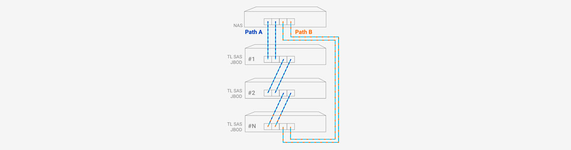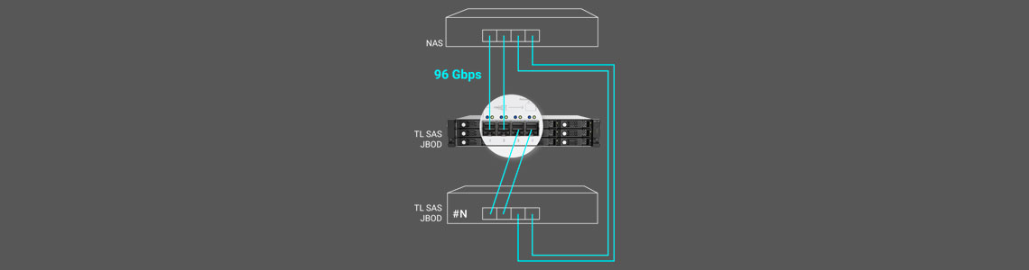 Conectando o storage NAS a vários JBODs TL SAS e REXP SAS JBODs, é possível aproveitar as vantagens do roteamento de caminhos múltiplos e agregação de links para se beneficiar de velocidades de transferência mais altas e disponibilidade do sistema.