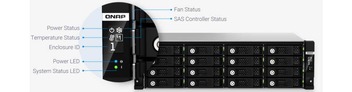 O TL-R1620Sdc Qnap é integrado por um expansor SAS35x28R SAS de 28nm de baixa potência e oferece suporte a discos SAS / SATA de 12/6 Gb / s.