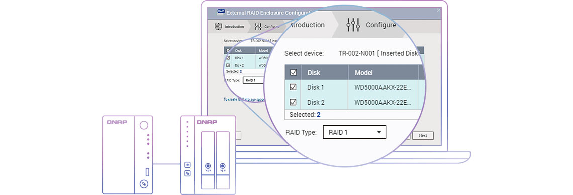 O gabinete de expansão adiciona rapidamente espaço de armazenamento no computador do usuário. Possibilita usar o comutador DIP para configurar um modo RAID de hardware ou gerenciá-lo utilizando o Gestor Externo de RAID da Qnap, além de monitorar a integridade e o status do NAS.