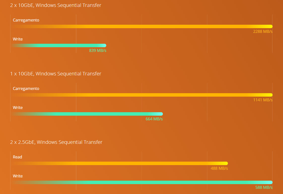 Com 2 portas de rede SFP+ 10GbE e 2 2,5GbE, o storage NAS oferece uma largura de banda incrível para possibilitar acesso a arquivos, backup/restauração e transferência de mídia de alta velocidade, além de permitir a alocação flexível de recursos de rede para aplicações e serviços individuais.