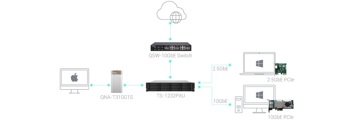A QNAP também oferece placas de expansão de rede 10GbE/5GbE/2,5GbE e um adaptador USB para 5GbE para dispositivos Windows/Linux, possibilitando que todas as estações de trabalho aproveitem redes de alta velocidade.
