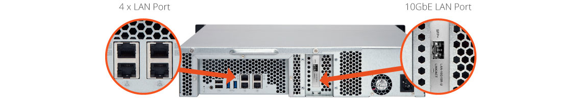 O NAS Qnap suporta rede 10G via placa de rede 10GbE SFP+ já inclusa, além das 4 portas Ethernet padrão. O adaptador de rede SFP+ 10GbE pode ser substituído por um 10G BASE-T ou um adaptador 10GbE de 2 portas, garantindo a flexibilidade e diversas possibilidades de entroncamento de dados no storage rack.
