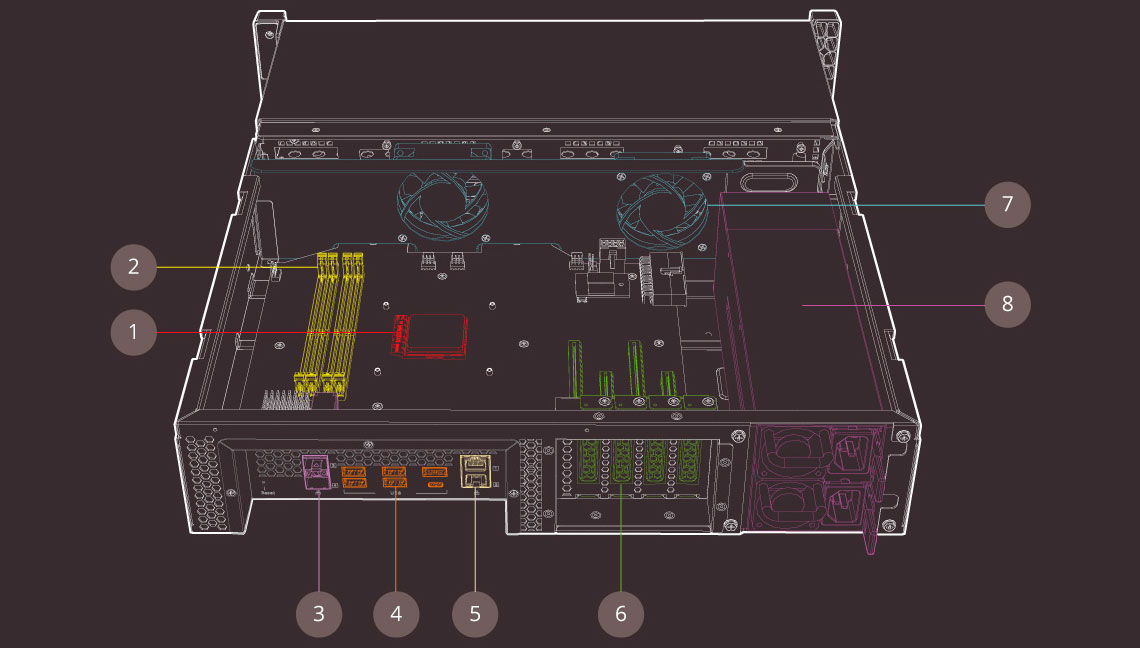 A instalação de adaptadores 10GbE / 40GbE, PCIe NVMe SSD é oferecida pelo servidor, com placas gráficas para processamento de vídeo ou GPU-passthrough para VMs, placas USB3.1 Gen 2 (10Gbps) ou placas de rede sem fio.