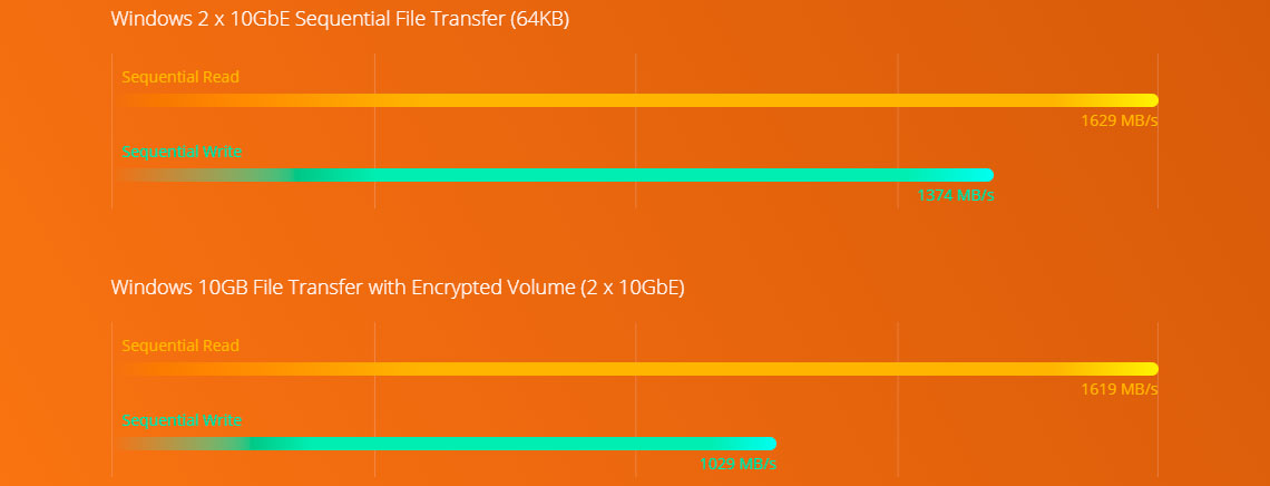 Através do processador AMD Ryzen 5 2600 ou AMD Ryzen 3 1200 e até 64GB RAM DDR4, o TS-1277XU-RP oferece alto desempenho com taxa de transferência de até 1629MB/s de velocidade de leitura e até 1374MB/s de gravação.