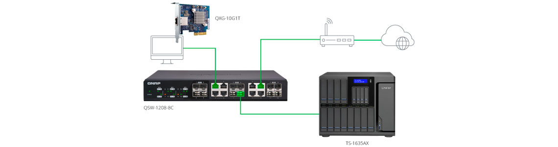 O TS-1635AX é compatível com 10GbE e possui duas portas SFP+ 10GbE para acelerar fluxos de trabalho sem muitos esforços. Para usuários sem um ambiente 10GbE existente, os switches não gerenciáveis 10GbE/NBASE-T da Qnap são opções ideais para simplificar a experiência de armazenamento de dados.