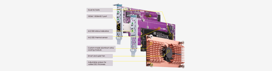 A QNAP QM2 é uma série de placas de expansão PCIe que possui dois slots SSD M.2 e/ou conectividade 10GbE. Isso permite que os usuários configurem com praticidade o cache do SSD ou o Qtier para otimizar o desempenho do storage NAS.