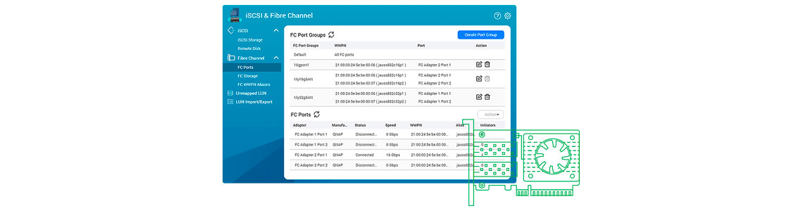 Agora é possível integrar um ambiente SAN no NAS Qnap com facilidade. Após a instalação de uma placa Fibre Channel Marvell - série Marvell QLogic 2500 de 8 Gb/s - no storage TS-1635AX, o usuário poderá configurar um destino Fibre Channel através do aplicativo iSCSI & Fibre Channel e aproveitar os diversos benefícios do Qnap NAS, incluindo a proteção de snapshots, o armazenamento em camadas do Qtier, aceleração de cache SSD e muito mais.