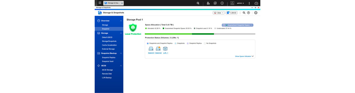 Um plano de recuperação de desastre requer várias camadas de proteção de dados e backups, o storage NAS TS-1635AX pode usar snapshots para registrar o estado de arquivos e as alterações feitas neles a nível de bloco, permitindo rapidamente reverter para versões anteriores no caso de um acidente com o arquivo.