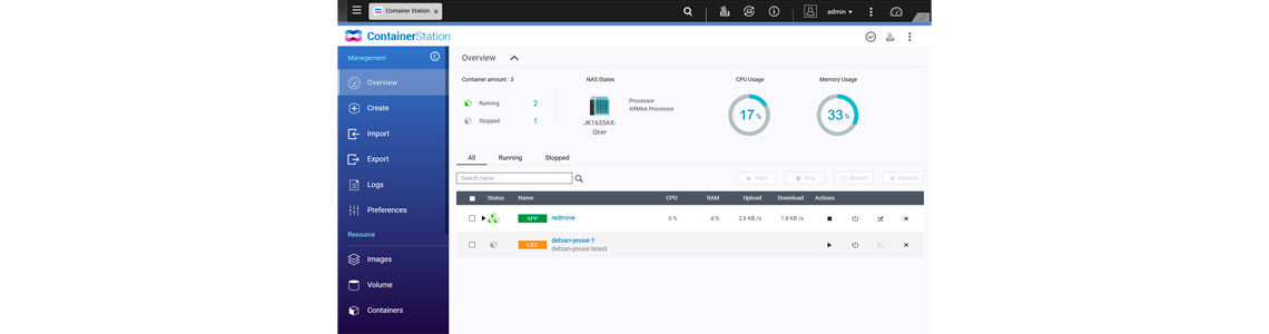 O storage TS-1635AX Qnap 16 baias suporta tecnologias de virtualização versáteis como recipientes (LXC e Docker) e máquinas virtuais (VMs) Linux com CLI (interface de linha de comando) para que o usuário possa migrar com praticidade aplicativos existentes ou implantar novas soluções no TS-1635AX.