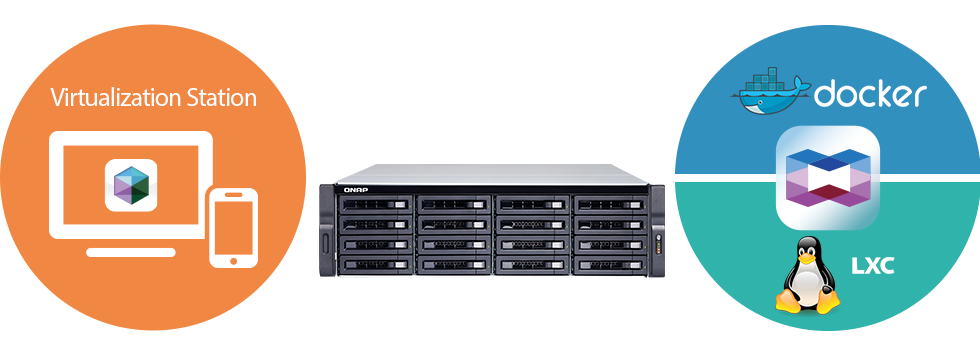 Hospede máquinas virtuais (VMs) no TS-1673U com o Virtualization Station que possui acesso por navegador ou VNC (computação de rede virtual), enquanto o Container Station integra as tecnologias de virtualização leves LXC e Docker para operar vários sistemas Linux no servidor 16 baias e para baixar aplicativos do Docker Hub Registry.