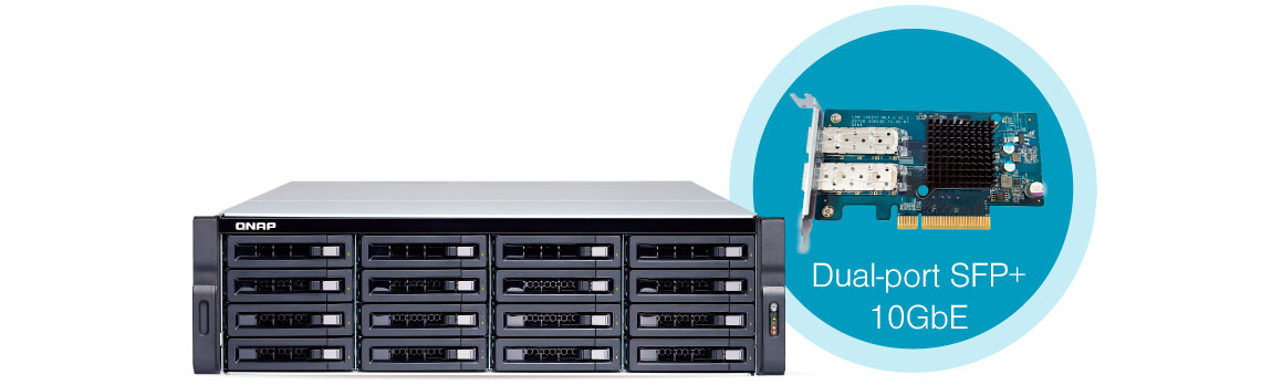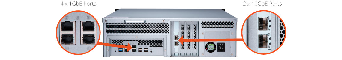 Uma placa de rede PCIe com duas portas SFP+ 10Gbe pré-instaladas é um dos itens de série do TS-1673U. Ideal para empresas que necessitam para realizar backups e restaurações rápidas ou até mesmo de largura de banda para virtualização.