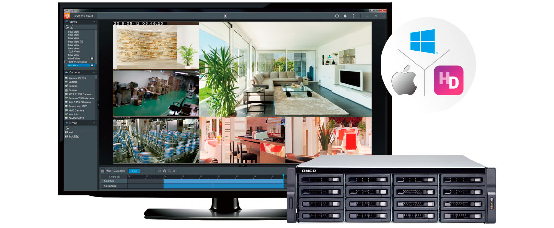 O QVR Pro oferece uma interface de monitoramento simples com ajuste de proporção e exibição de imagens das câmeras IP, possui recurso atualizado de linha do tempo com pesquisa de vídeo e identificação de exibições rápida no modo de monitoramento ao vivo, além de permitir o monitoramento de exibições, reprodução de imagens sem alternar entre janelas, adição e edição de câmeras em massa e pesquisa de câmeras em várias LANs.