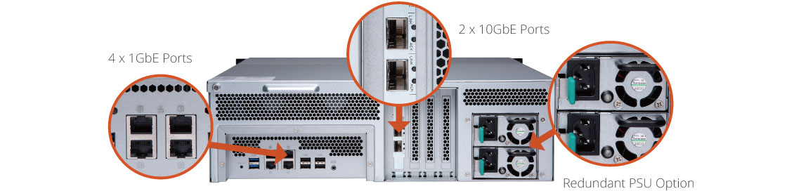 Uma placa de rede PCIe com duas portas SFP+ 10Gbe pré-instaladas é um dos itens de série do TS-1673U-RP. Ideal para empresas que necessitam para realizar backups e restaurações rápidas ou até mesmo de largura de banda para virtualização.