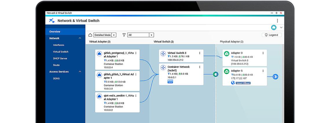 Permite reorganizar de modo facilitado as conexões de rede física e virtual, para alocar recursos de rede adequados para o TS-1683XU-RP, máquinas virtuais e containers quando necessário. Proporcionando implementação de rede simplificada e eficiência de gerenciamento da rede aprimorada.
