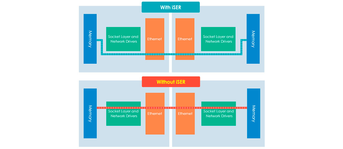 Quando o servidor VMware e storage suportam iSER, é possível fornecer até 60% de aumento no desempenho de leitura / gravação aleatória e 50% de latência, fornecendo uma ferramenta para otimizar as aplicações de virtualização.
