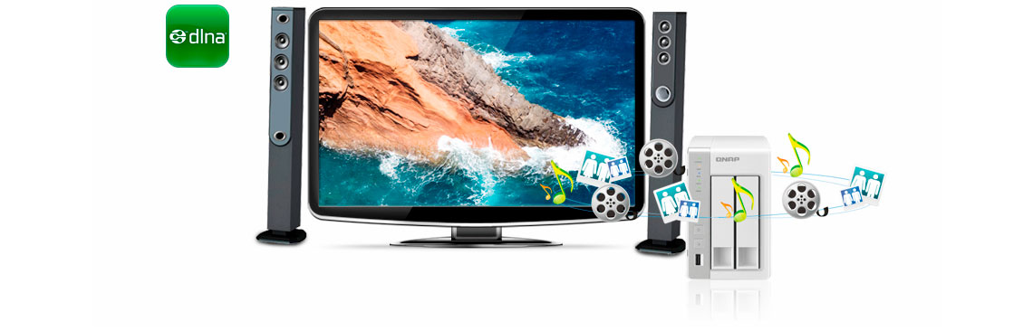Como servidor NAS compatível com DLNA, o TS-212P permite visualizar foto, reproduzir vídeos e ouvir música em quaisquer dispositivos DLNA, como smartTVs HD, consoles de jogos, home theaters, tablets, sistema Hi-Fi ou ouvir estações de rádio através da internet de qualquer lugar.