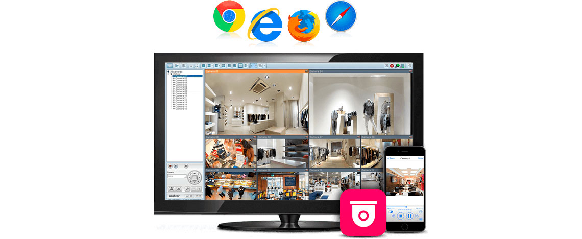 Com aplicativos para dispositivos móveis, é possível visualizar os canais de imagens em qualquer lugar, ou até mesmo transformar dispositivos móveis em câmeras de vigilância.
