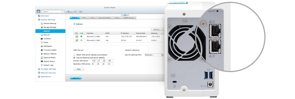 Integrado no servidor NAS, as duas portas de conexão LAN suportam várias foras de comunicação com sua rede local. O TS-231K permite agregar as duas portas LAN num único link para aumentar a banda de transmissão dos dados.
