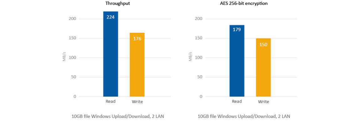O mecanismo de criptografia de hardware fornece transferência até 179MB/s com volume AES 256 bits, aumentando a segurança do sistema e garantindo a segurança dos dados armazenados.