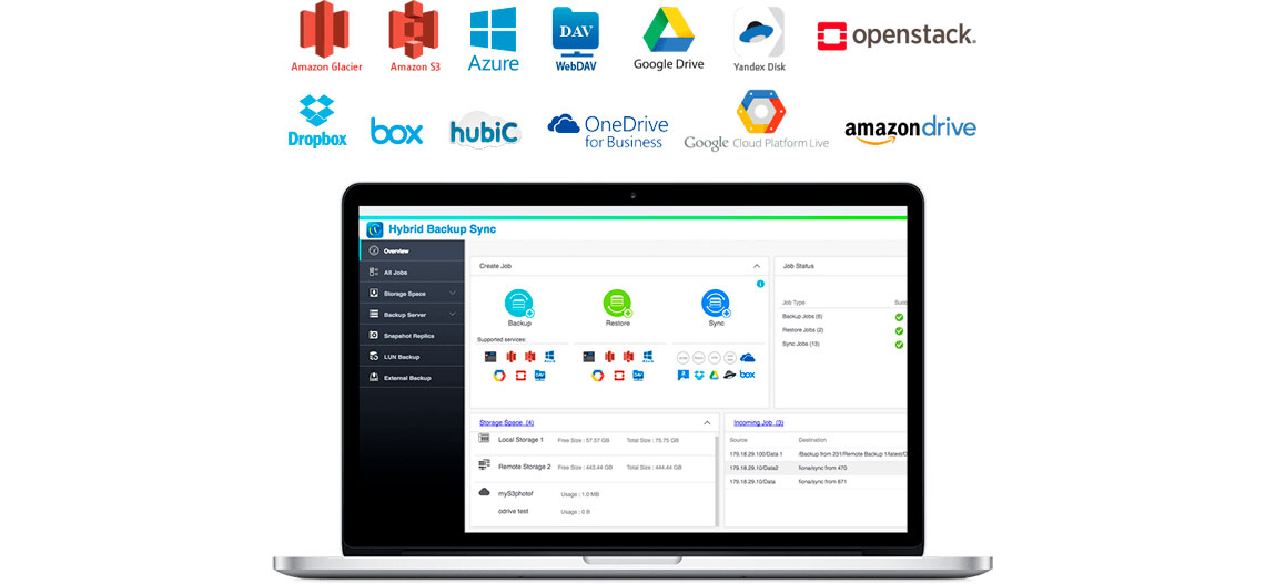 Realize a transferência de arquivos para dispositivos externos, replique dados com outro servidor Qnap ou sincronize dados com os principais serviços de nuvem nuvem como o Google Drive, Dropbox, Microsoft Azzure, Google Cloud, OneDrive, Box, hubiC, Amazon S3 e Amazon Drive, tudo isso utilizando o Hybrid Backup Sync 3.