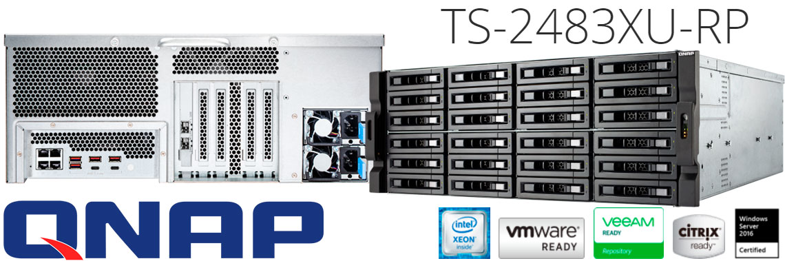 O Qnap TS-2483XU-RP oferece uma solução de armazenamento de alto desempenho com 24 baias hot-swappable para discos SATA com fonte de alimentação redundante. Equipado com processador Intel Xeon Six Core, 16GB de memória RAM, 4 portas LAN gigabit, 2 10GbE SFP+, 6 portas USB 3.1 e 4 slots PCIe para instalação de placas adicionais.