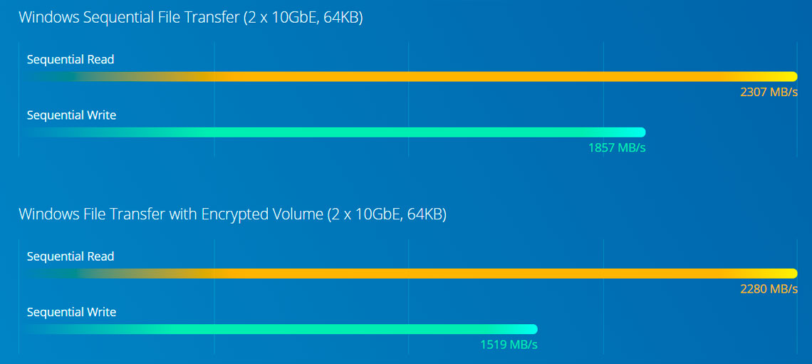 Alimentado com o processador Intel Xeon E-2124, 16GB de memória DDR4 ECC (expansível até 64GB máximo) e uma fonte de alimentação redundante, fornecendo desempenho com velocidade de transferência até 2307MB/s de leitura e até 1857MB/s de gravação.
