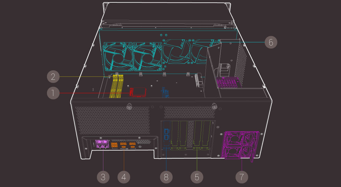 As placas gráficas, que são otimizadas para cálculos e transformações gráficas, podem ser instaladas no slots PCIe do TS-2483XU-RP.