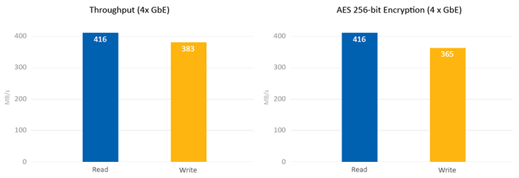 O processador é burst-up, isto é, aumenta automaticamente o clock de 1.6GHz para 2.08GHz ao executar tarefas que consomem CPU. O storage Qnap possui mecanismo de criptografia por hardware Intel AES-NI, que impulsiona as velocidades de transferência até 416MB/s com criptografia 256-bits AES, tanto para volume NAS completo como pastas compartilhadas.