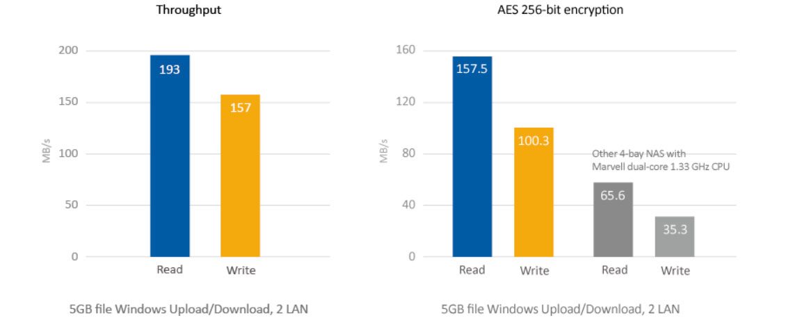 Equipado com processador ARM Cortex-A15 dual core 1,4Ghz e 1GB de RAM DDR3, o NAS de 4 baias estabelece um alto desempenho para grupos de trabalho proporcionando excelente desempenho de taxa de transferência até 193MB/s de leitura e 157MB/s de gravação.