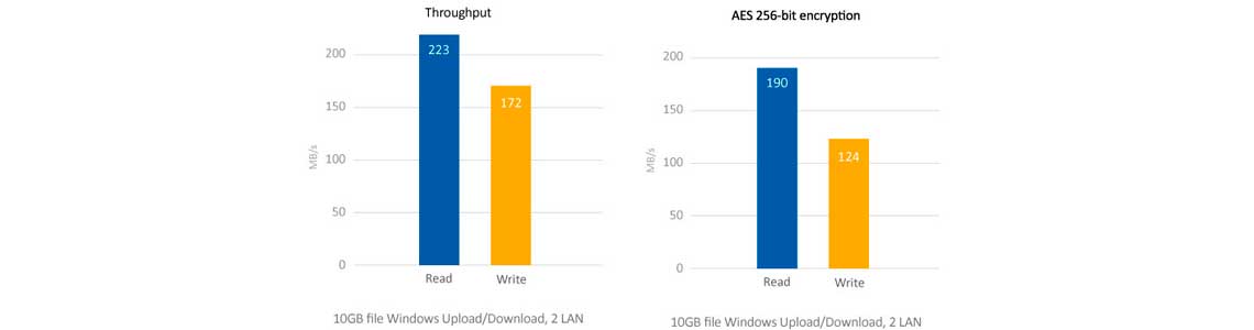 Com velocidade de transferência até 110MB/s e 80MB/s na leitura e gravação respectivamente, o NAS Qnap oferece o melhor desempenho em aplicações com criptografia habilitada e atinge velocidade de transferência de 30MB/s com AES-256 bits nos volumes, aumentando assim a segurança das informações armazenadas.