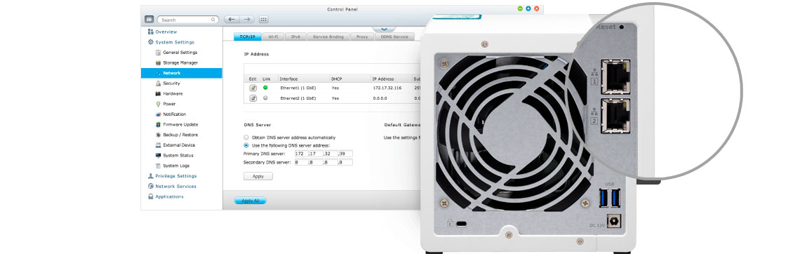 Integrado no servidor NAS, as duas portas de conexão LAN suportam várias foras de comunicação com sua rede local. O TS-431K permite agregar as duas portas LAN num único link para aumentar a banda de transmissão dos dados.