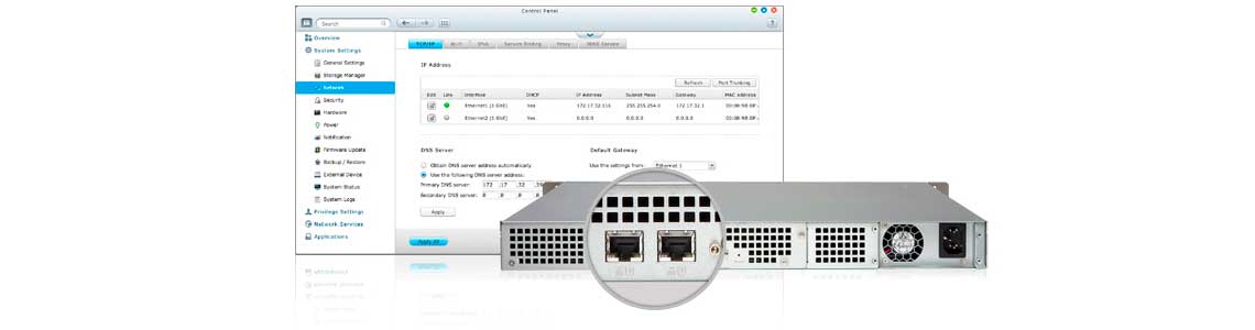 O TS-431U Qnap suporta múltiplos modos para trunking de porta, permitindo configuração de agregação de link (link agregation) , que aumenta consideravelmente a transmissão e recepção de dados.