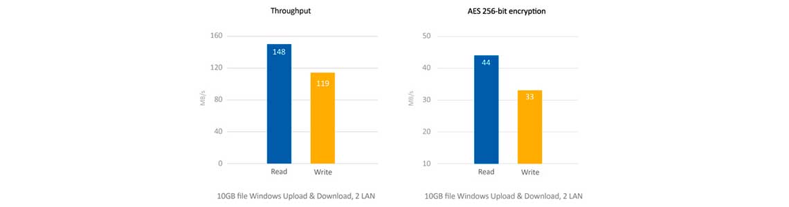 O desempenho melhorado para criptografia do storage 4 bay Qnap proporciona transferências de 33MB/s com volume AES-256 bits, entregando desempenho e segurança para o sistema.