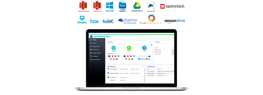 O NAS rackmount suporta serviços de nuvem como Amazon Glacier, Azure Storage, Google Cloud Storage, Google Drive, Microsoft OneDrive para empresas, Dropbox, Amazon Drive, Yandex Disk, Box, hubiC e serviços compatíveis com Amazon S3 / OpenStack Swift / WebDAV.