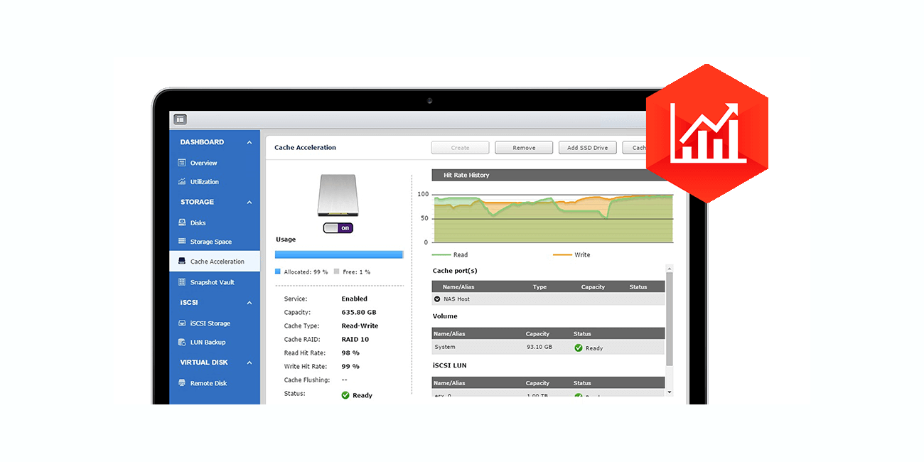 Para isso o TS-431XeU conta com VJBOD (Virtual JBOD) para expansão de capacidade utilizando espaço livre no armazenamento e aceleração com Cache SSD para aumentar a eficiência operacional do NAS.