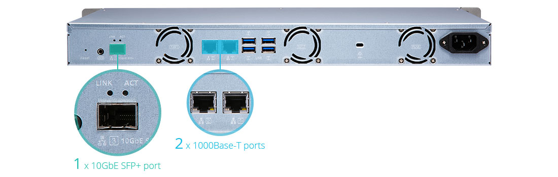Além de duas portas LAN gigabit, o TS-431XeU também inclui uma porta 10GbE SFP+ para suportar redes de alta velocidade de 10GbE para empresas que precisam de maior largura de banda para virtualização, backup e restauração rápida.